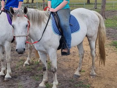 Holly, the wise old grey mare, is Chloe’s half-sister. From a thoroughbred mare and a Clydesdale stallion, she is an experienced therapy horse. However, not a beginner’s ride.